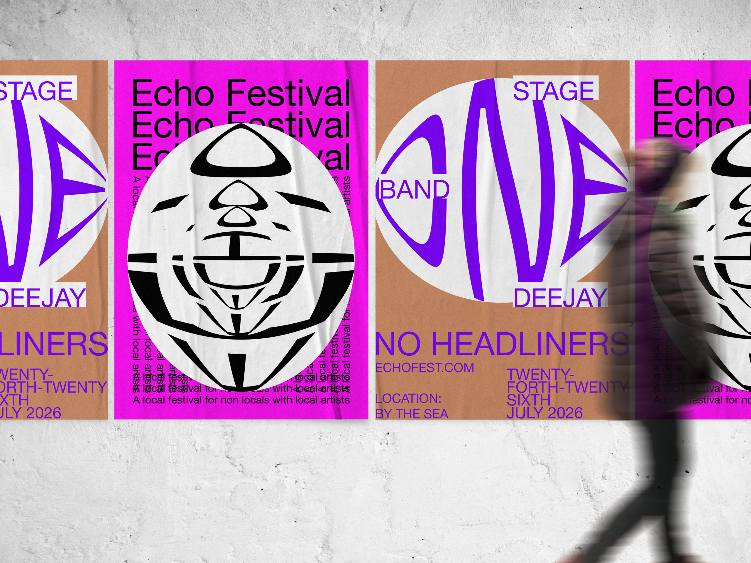 Inspired by early 90s rave culture, his concept embraces chaotic kerning, cropped forms and high-voltage contrast. At its centre the Echo Egg – a warped typographic sculpture that feels abstract at first glance, then slowly reveals the word ‘Echo’. Raw, unapologetic, and rooted in underground activity.