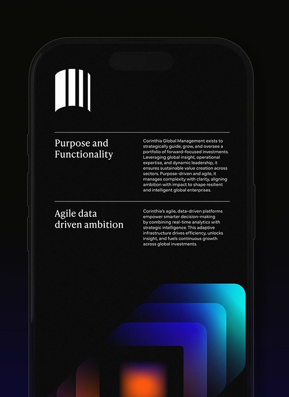 From these foundations the driving idea ‘Kinetic Intelligence’ was born. Bridging the strategic brand positioning to the creative execution and informing every part of the brand ecosystem. It captures Corinthia’s forward motion and sharp intelligence — a brand that looks, feels and behaves like the future of Private Credit. From brand mark to graphic language and colour through to the digital experience, motion behaviour, and tone of voice. The visual identity was designed to reflect Corinthia’s mission and place them in stark contrast to the competition.